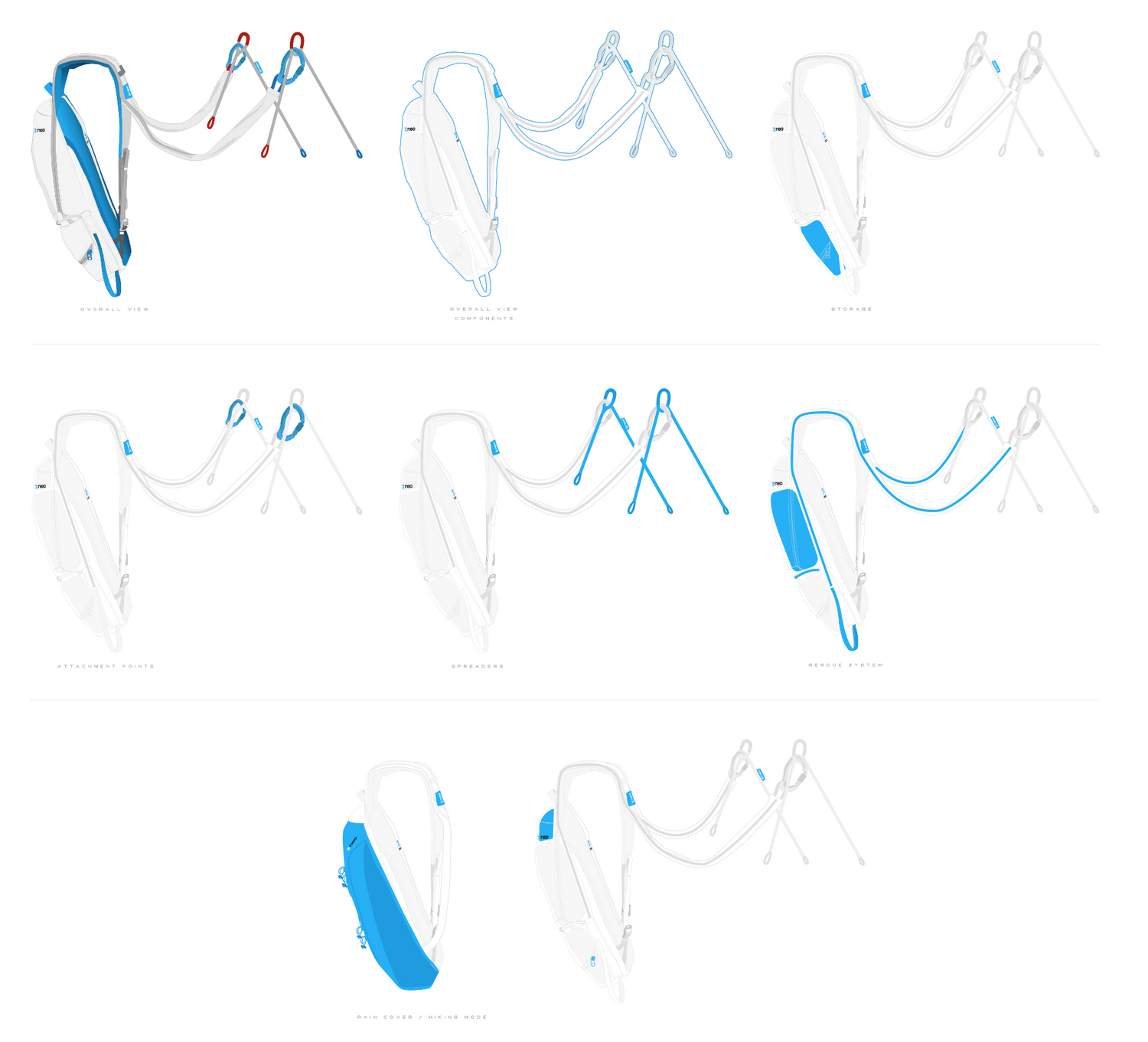 Un concept simple, efficace et rapide : vous posez le sac sur la sellette, connectez les drisses secours, bouclez… et volez.
