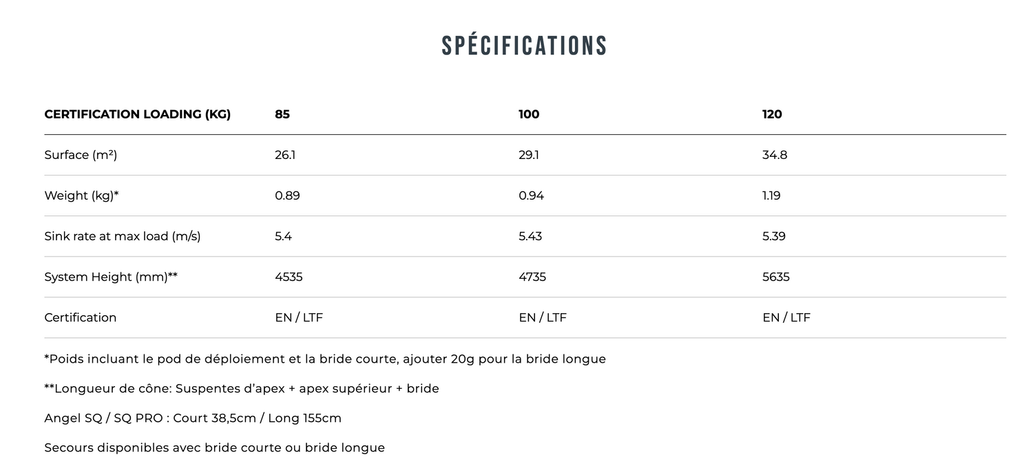 L’Angel SQ PRO est fabriqué avec les matériaux de la plus haute qualité : Dominico 10D et suspentes Dyneema Cousin. L’Angel SQ PRO est certifié EN et disponible en tailles 85, 100 et 120. Ces matériaux ont été choisis pour l’équilibre optimal qu’ils offrent en termes de longévité, de poids et de volume de pliage.