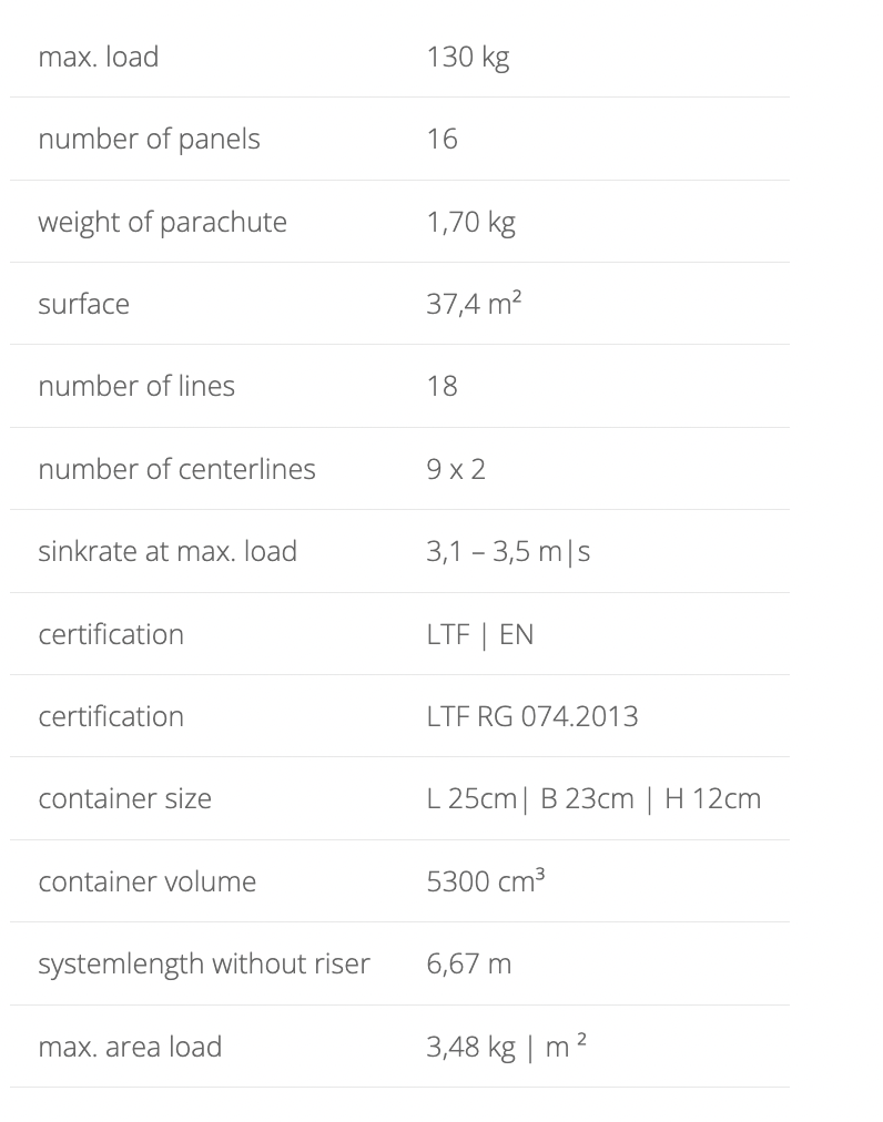 -Un secours de type Rogallo reste imbattable en termes de temps d'ouverture (2 secondes) ainsi que de taux de chute (3,5 m/s). Il assure une descente stable, avec une pente de plané dirigeable qui lui permet de voler vers une zone sûre et de s'y poser en douceur.