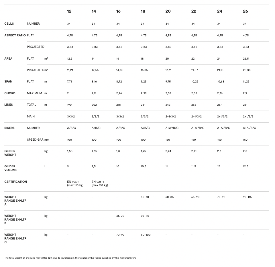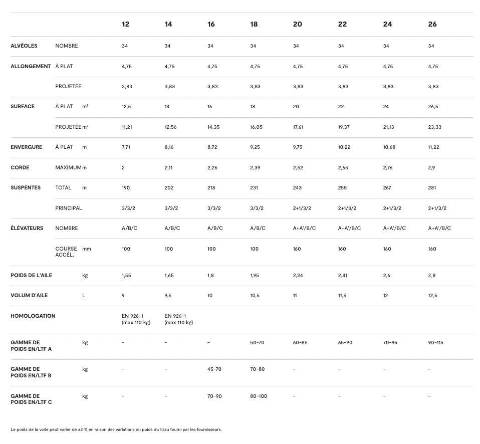 Un pilotage agréable et plus intuitif pour les tailles 22, 24 & 26. En raison de leur plus petite taille et d’une charge alaire plus élevée, les intermédiaires tailles en 16, 18 & 20 volent plus vite et ont un comportement plus dynamique. Les modifications apportées au niveau du bord d’attaque les rendent particulièrement stables et leur confèrent des caractéristiques de vol similaires aux plus grandes tailles. Appréciez une touche plus audacieuse avec les plus petites tailles (12 et 14), qui sont des Speed Wings !
