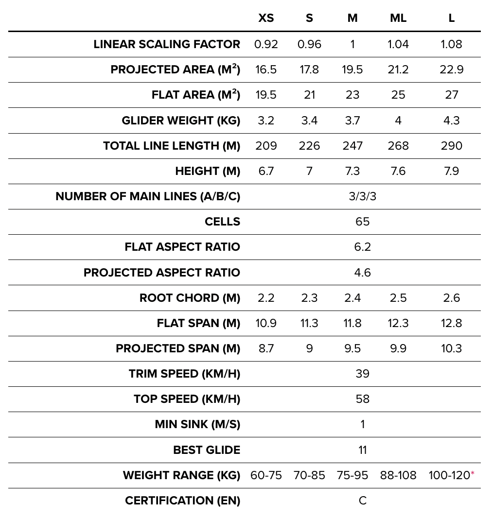 Avec un poids de 3,2 kg à 4,3 kg réparti sur cinq tailles, la LYNX 2 est l'une des ailes les plus légères de sa catégorie, sans pour autant sacrifier sa durabilité. Nous avons utilisé du tissu 32 g/m² aux endroits stratégiques pour renforcer le bord d'attaque là où il en a le plus besoin. Nous avons également sacrifié quelques grammes au niveau des élévateurs, en choisissant des sangles de 12 mm renforcées de Kevlar, faciles à manier, plutôt que du Dyneema façon lacets.