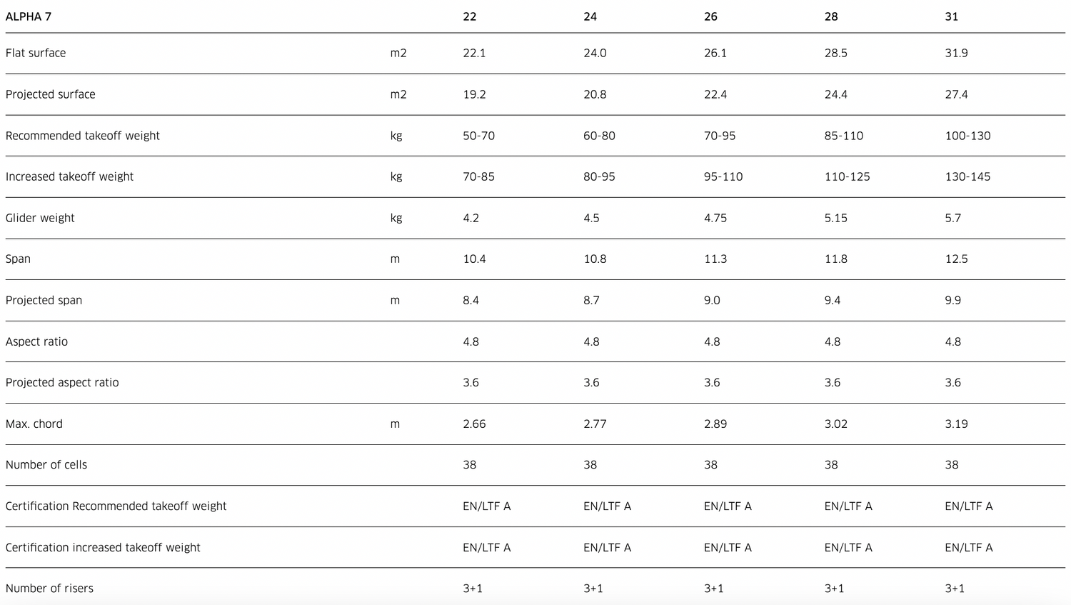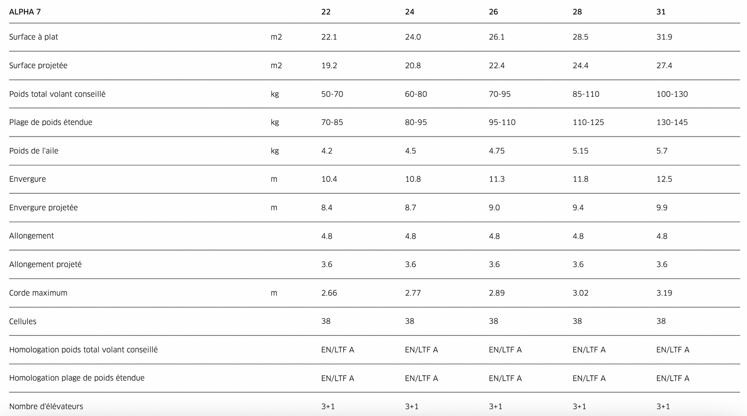 L’ALPHA 7 n’a pas seulement été conçue pour le temps de formation, mais aussi et surtout pour le temps qui suit. Elle s'adresse à tous les pilotes qui accordent de l’importance à une grande sécurité, combinée à des performances séduisantes. Grâce à sa technologie moderne, due entre autres au « 3D Shaping » au niveau du bord d’attaque et à une construction ingénieuse basée sur des nervures diagonales, elle fait preuve d’un niveau de performances étonnant en classe A.