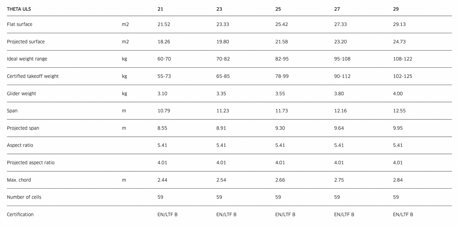 La construction ultralégère nouvellement développée pour l'OMEGA ULS est désormais disponible pour la première fois pour un groupe de pilotes plus large. Grâce à la combinaison de l'utilisation des matériaux les plus légers et d'une structure interne au poids extrêmement optimisé, la THETA ULS est disponible à partir de 3,1 kg.