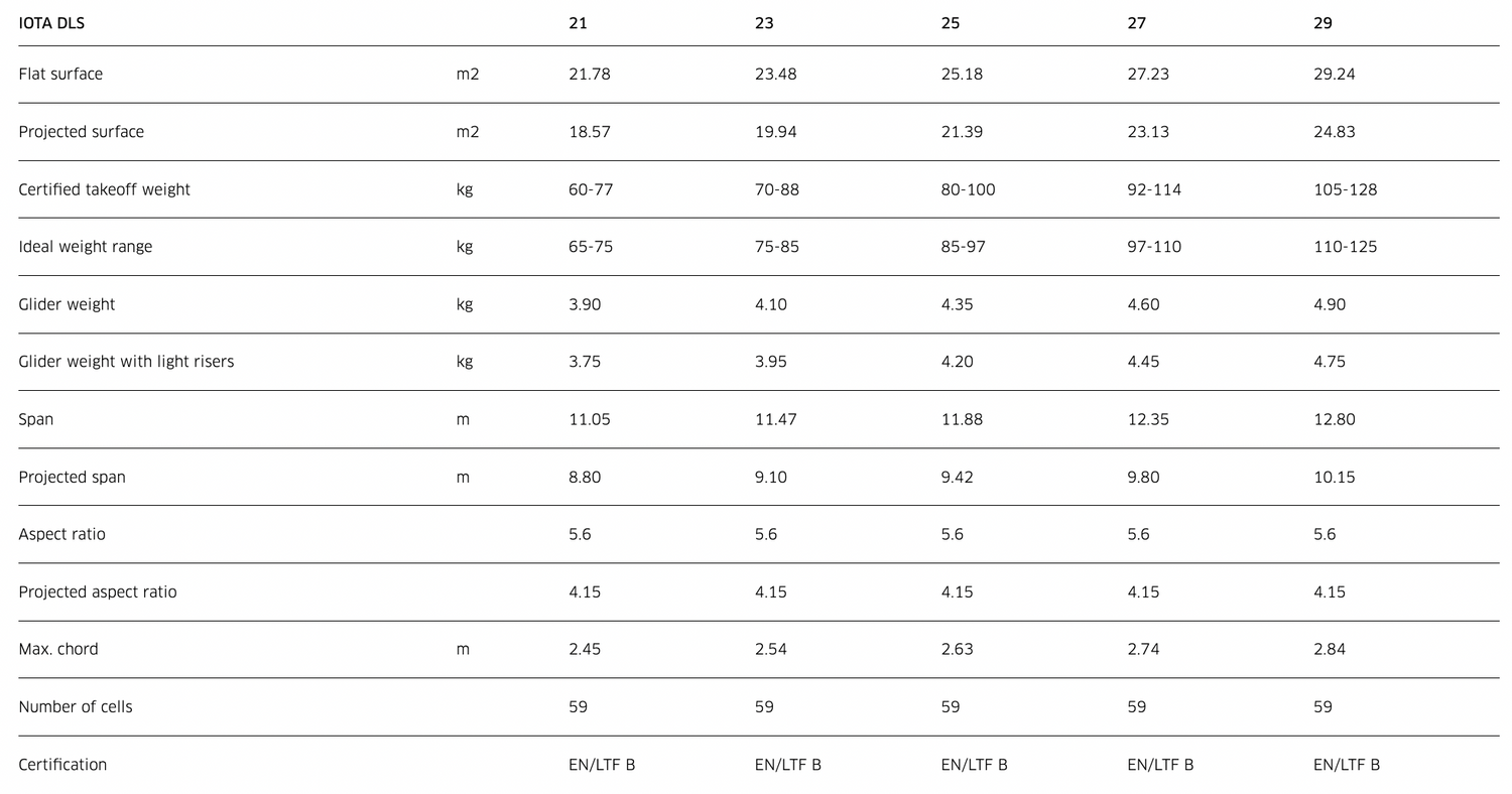 La grande stabilité en tangage du profil préserve l'énergie et la transforme en performance, en particulier lors du vol plané en air turbulent. Une performance encore plus élevée résulte de la réduction de 4 % de la surface des suspentes et du shaping 3×3D sophistiqué. Ce dernier confère à la IOTA DLS un bord d'attaque parfaitement lisse.
