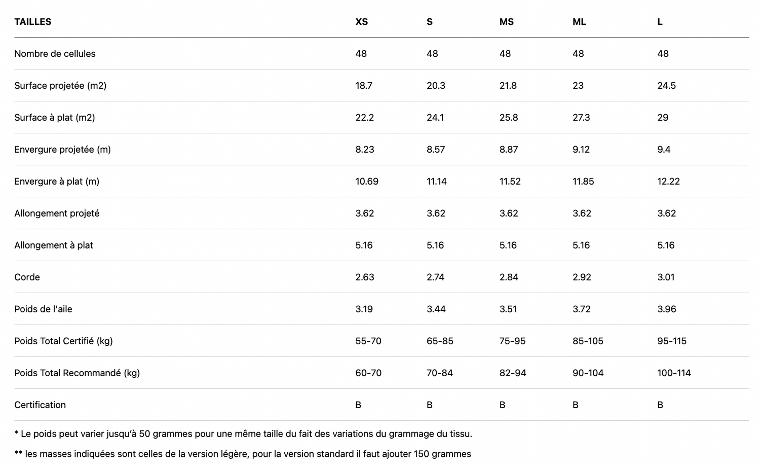 - Position des accrochages de suspentage modifiée pour améliorer la stabilité en vol accéléré.