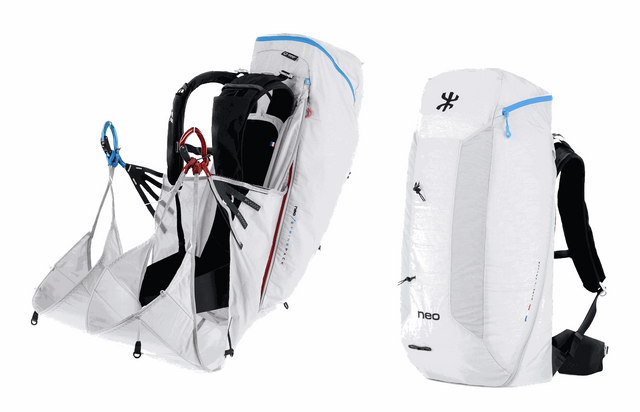 Le renfort dorsal et les bretelles sont les mêmes en position vol et marche. Cette technique permet de sauver du poids et du volume de portage et rend l’ensemble plus simple d’utilisation.