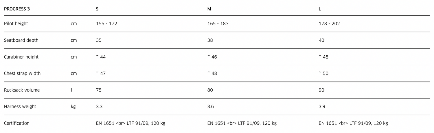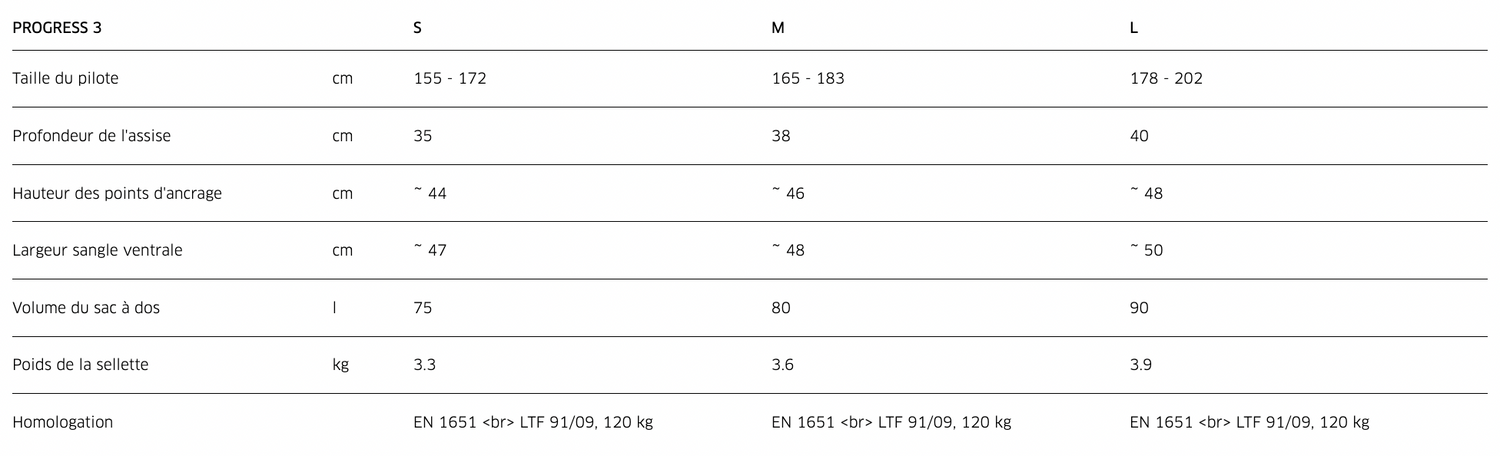 L’enveloppe de forme ergonomique de la PROGRESS 3 épouse automatiquement le corps du pilote, en vol ; des cuissards renforcés et un maintien astucieux des lombaires assurent par ailleurs un appui agréable. Sur le sac à dos, des bretelles confortables et la partie dorsale en mesh garantissent un grand confort lors du transport.