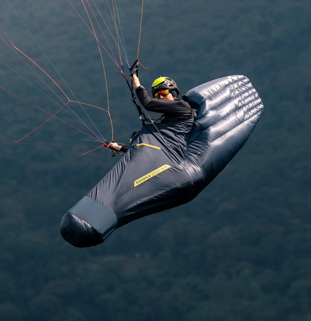 Le carénage à cloisons RAM se gonfle sous l’effet de l’air entrant et recombine le flux derrière le pilote. Cela améliore considérablement la traînée et augmente les performances de vol plané.