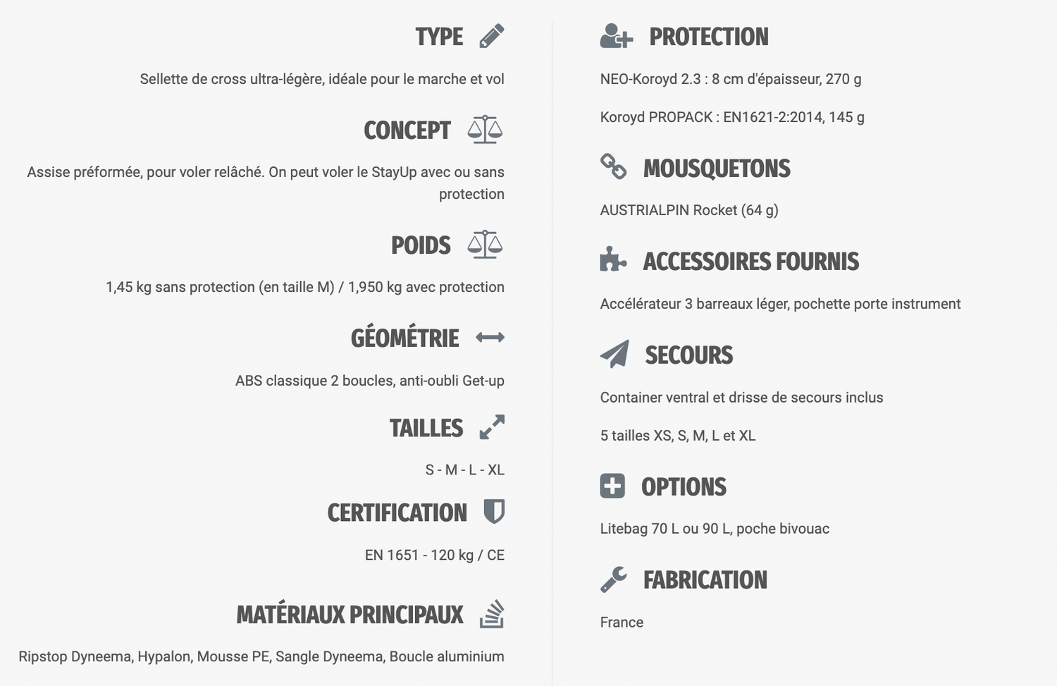 Enfin, cette sellette de haute qualité possède une grande résistance. Ses pièces d'usure telles que les fermetures du cocon et le plateau carbone sont facilement changeables sans nécessiter l'intervention d'un atelier. Le StayUp 2.0 est équipé de deux protections certifiées EN, LTF et CE pour la 1ère et CE pour la seconde : la NEO-Koroyd 2.3 de 8 cm sous l'assise et la Koroyd PROPACK. Ses protections protègent la colonne vertébrale contre les impacts. Pour information, sachez que la sellette peut être utilisée sans ces protections en les retirant simplement de leurs poches.