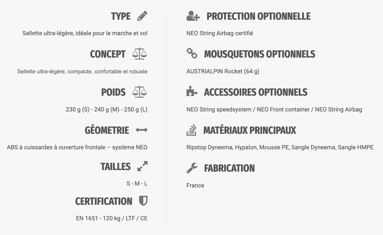 Léger par sa construction et non par des compromis sur des matières, tel était notre objectif. Le String est ainsi entièrement composé de tissu ripstop Dyneema ultra résistant à la déchirure et à la déformation. Sa structure est en sangle HMPE (polyéthylène à haut module) : la fibre synthétique la plus résistante et légère. Défi relevé, le String NEO est très robuste et ultra-léger.
