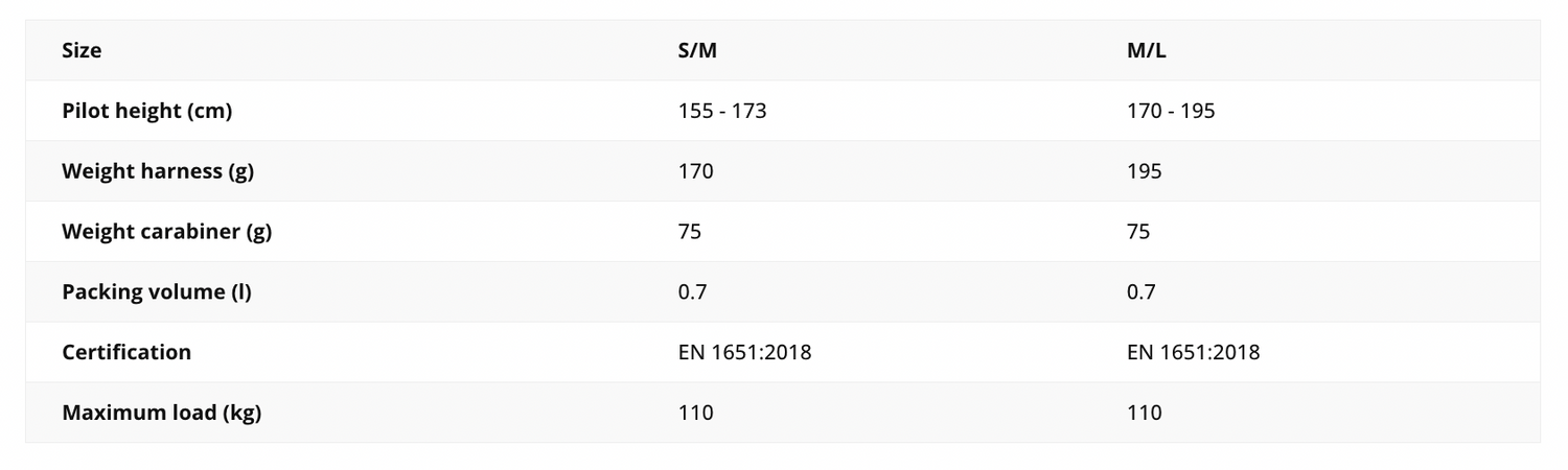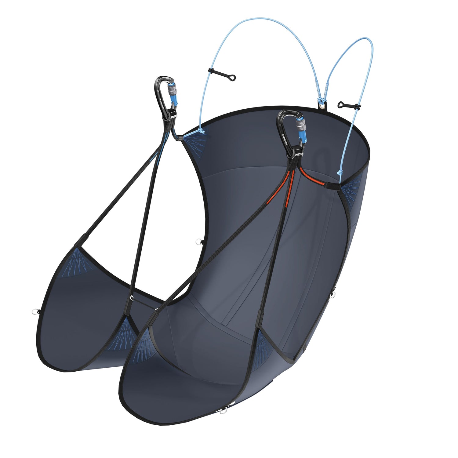 En évitant volontairement les raidisseurs supplémentaires, la sellette est « flottante » – comme le principe du hamac – et s'adapte ainsi à la morphologie du pilote. Cela signifie qu'une grande surface de pilotage peut être couverte avec une seule taille.