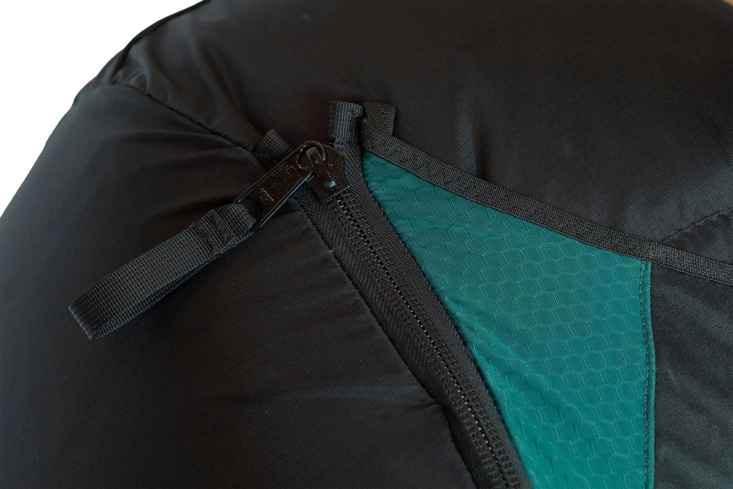 La fermeture de la jupe se fait grâce à une cordelette, puis 2 zip centraux transforment le pouf bag en un véritable sac de portage ce qui facilite le passage des portiques en station de ski.