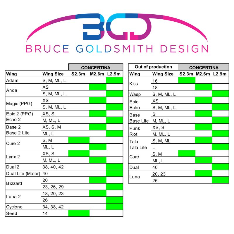 Le Concertina BAG BGD rend l'emballage facile, tout en protégeant le bord d'attaque de votre aile. Les sangles internes gardent l’aile en place, et le tissu perméable à l'air vous permet de presser pour'atteindre une petite taille d’emballage. Pour ceux qui préfèrent laisser leur sellette attachée à l'aile, le fond du sac a une fermeture à cordon pour sortir les élévateurs, et des sangles externes tiennent le sac plié.