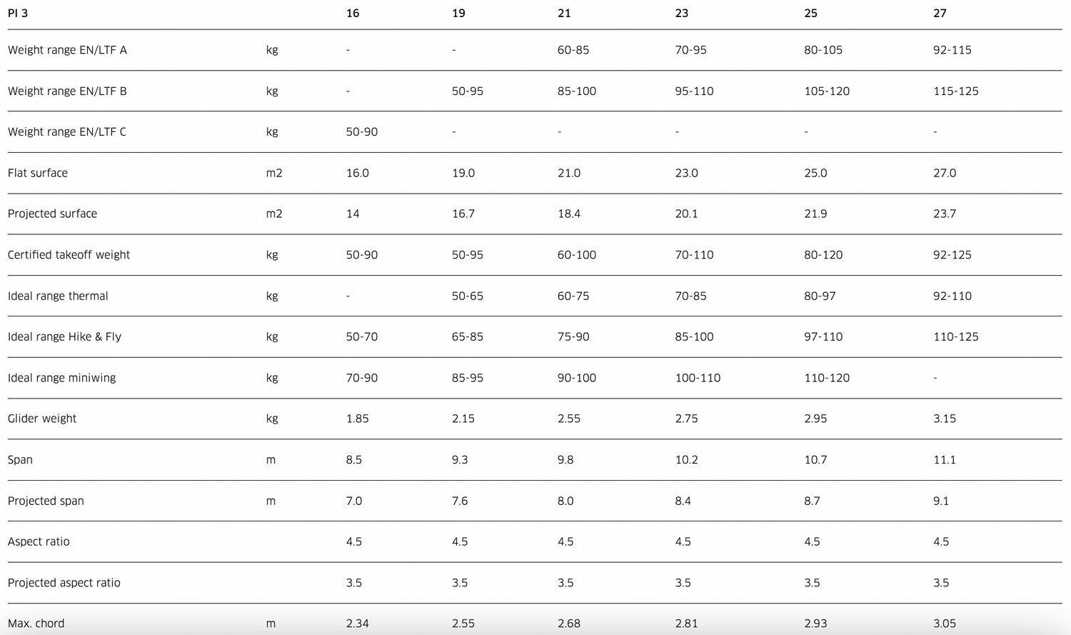 Depending on its wing loading, the PI 3 will place different demands on its pilot. The higher the loading, the more demanding the flight characteristics and piloting skills will be. Small wings are fundamentally more agile, livelier, and more demanding to fly, even when flying with their normal wing loading. You can see the different piloting requirements based on wing loading in the table opposite.