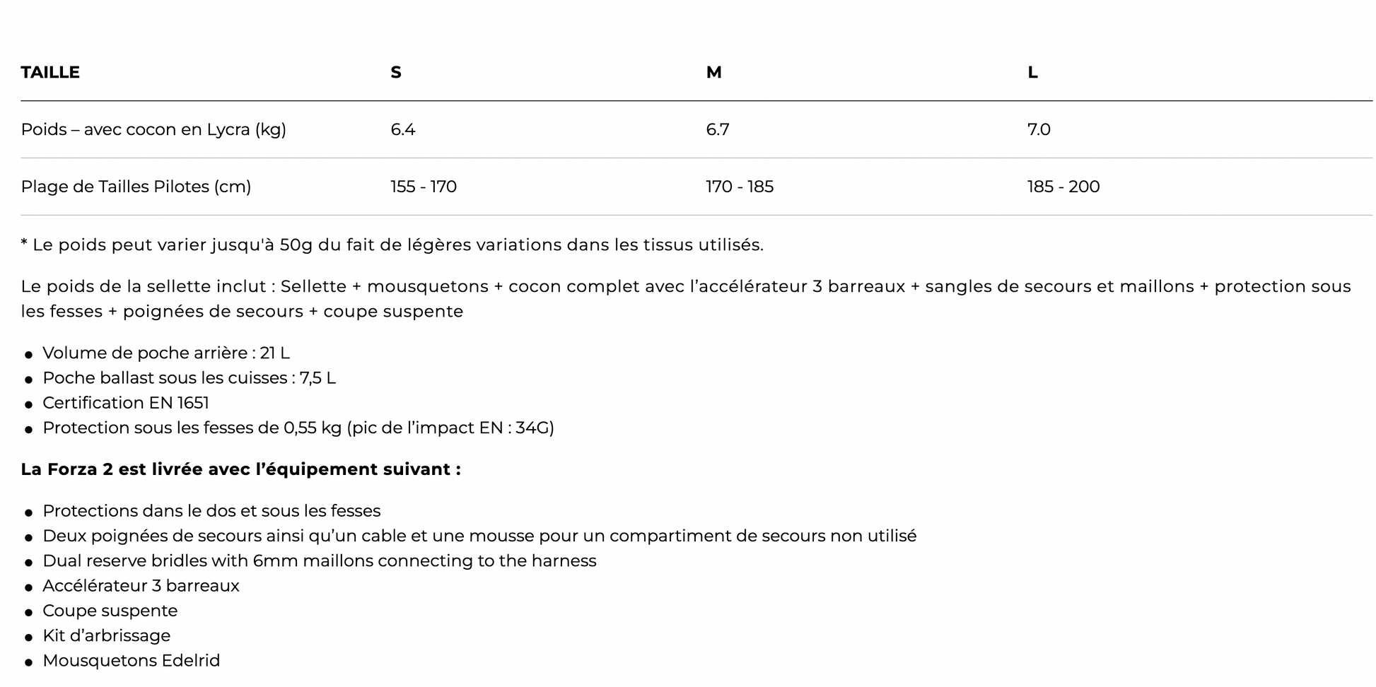 Pensée pour les vols de distance, la Forza 2 offre de multiples espaces de rangement pratiques : deux grandes poches latérales facilement accessibles en vol, une poche zippée sur le dessus du cocon, un cockpit spacieux avec poche à batterie intégrée, un compartiment sous les cuisses, ainsi qu’une grande poche arrière pouvant accueillir une outre d’hydratation dont le tuyau reste accessible en vol. Un trou d’évacuation est prévu sous le siège pour se délester facilement.