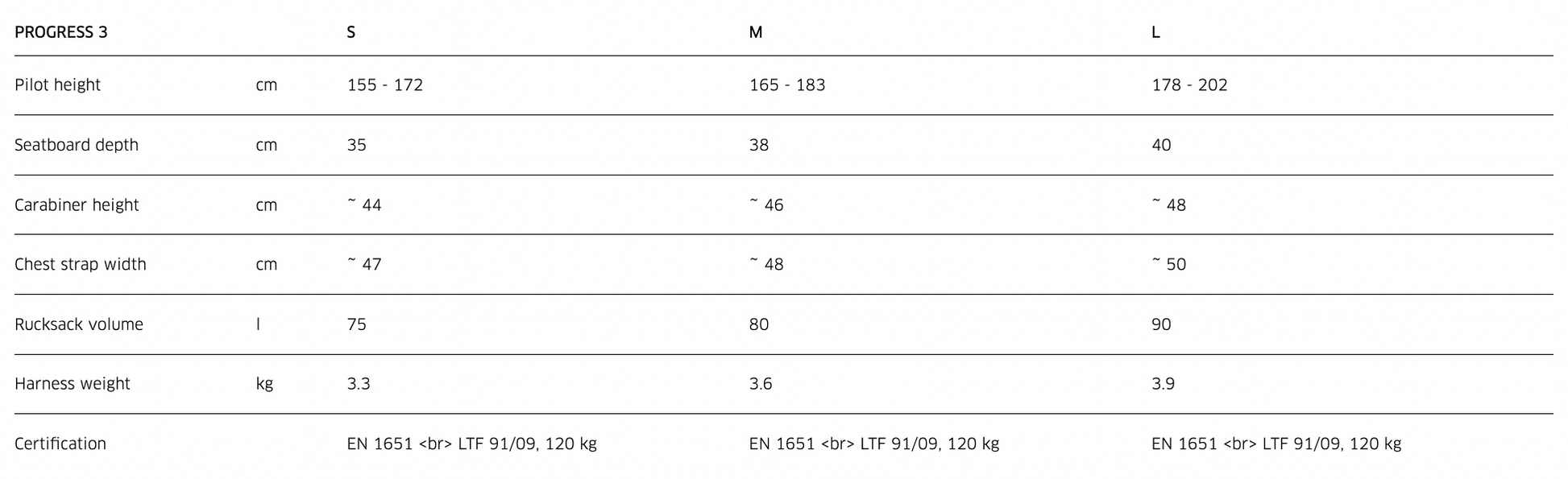 L’enveloppe de forme ergonomique de la PROGRESS 3 épouse automatiquement le corps du pilote, en vol ; des cuissards renforcés et un maintien astucieux des lombaires assurent par ailleurs un appui agréable. Sur le sac à dos, des bretelles confortables et la partie dorsale en mesh garantissent un grand confort lors du transport.