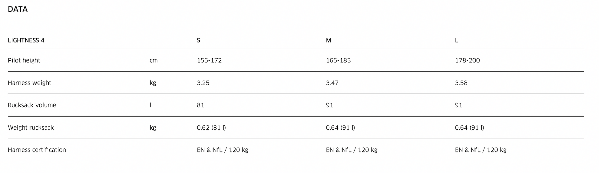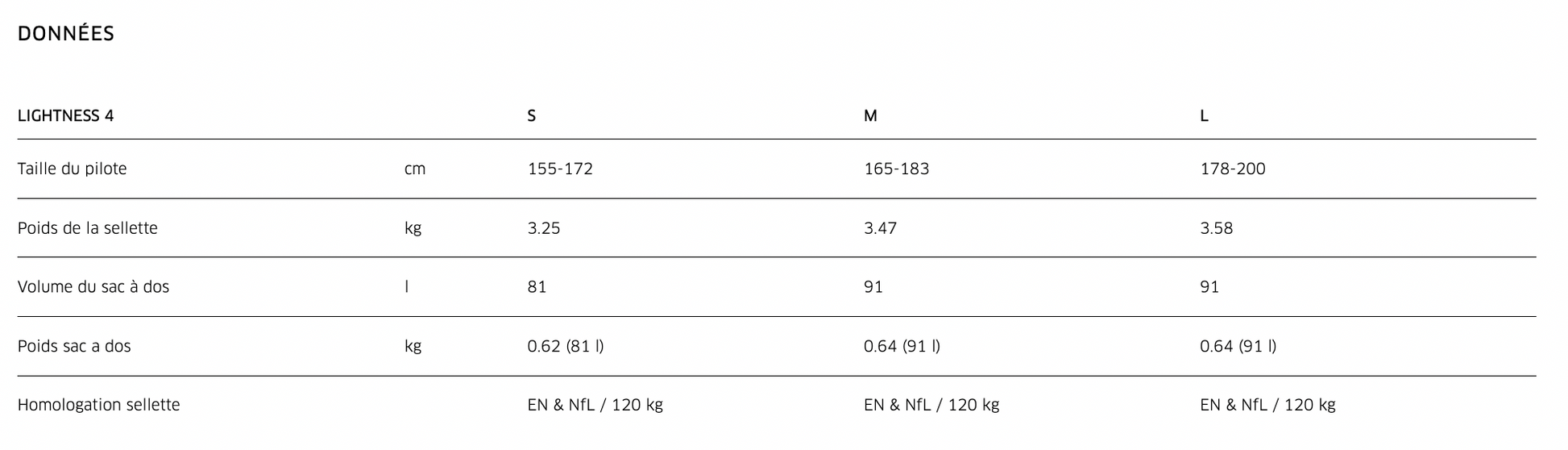Pour choisir ta taille idéale de sellette, tiens compte non seulement de ta hauteur mais aussi de ton poids. Tu peux configurer ta LIGHTNESS 4 de manière individuelle en combinant les différentes tailles de coque d'assise et de speedbags. Si tu te trouves aux limites d'une taille, nous te recommandons de tester les deux tailles, tu peux le faire chez parapente-proshop à Chamonix.