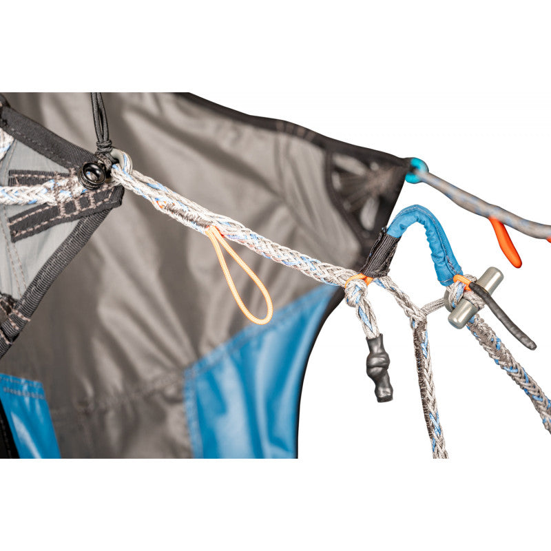 Cette technologie offre un confort inégalé pour une sellette de ce poids, et permet de faire corps avec la sellette. C’est la seule sellette permettant de se connecter directement à la voile sans maillons !
